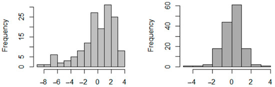 As part of the principal component analysis, we identified the distribution of results of the variables in the previously identified dimensions. In the case of Dim 1, an asymmetry to the right is observed, indicating better performance results of the organizations in the variables that are part of this dimension. In the case of Dim 2, the organizations’ performances have a more symmetrical distribution, showing results closer to their mean. Figure 7 shows the distributions.