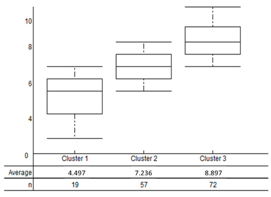 According to the aforementioned performances, we analyzed the classification of the organizations according to the high, medium, and low levels of cluster performance. The cluster with high performance has an average score of 8.89 and includes 72 organizations. As for medium performance, it has an average score of 7.23 and concentrates on 57 organizations. Finally, the cluster grouping of the 19 organizations with low performance obtained an average score of 4.49 (Figure 8).
