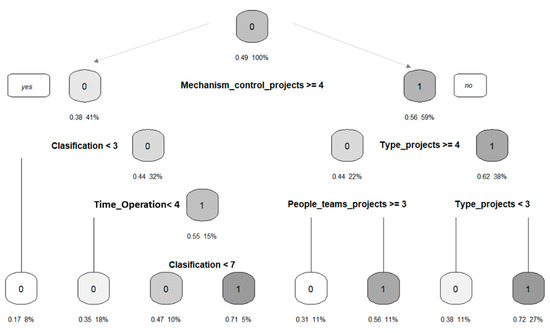 Finally, a classification tree with a pruning process was used to establish the organization of the relationships within each cluster. For the cluster related to the best-performing organizations, the most relevant variables were identified, including the type of projects developed, the type of legal organization, the size of the project teams, and the level of income in the previous year. As for the determining variables of organizations that do not perform well in projects, we observed an important intervention of the project control mechanisms, the size of the project teams, and the operation time of the project, together with its organization in the market. Figure 9 presents the results.