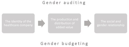 The idea of social reporting and gender accounting in PA, to which health companies belong, are not new [,] and allow stakeholders such as citizens to use gender budgeting to hold governments accountable for their policies and actions in the field of gender equality, with the goal of promoting material equality among people of all genders []. This approach is aimed at verifying, on one hand, the equal distribution of expenses by companies between men and women and, on the other, to implement active policies to improve the inclusion of the less represented gender: women [].