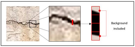 However, the measurement was based on a fixed-size pixel, hence there was a range of error from the actual crack width. This error value was considered to have occurred from parts that contained the crack wall within the area of the pixel. This was judged to be an error value occurring in the part where the area included in the pixel includes both the crack width and the wall surface, as shown in Figure 6. This resulted in a high error rate, as shown in Table 3. Additionally, parts in which the crack framework was not extracted were seemingly blurred areas, which were believed to have been lost during the SR transformation process.