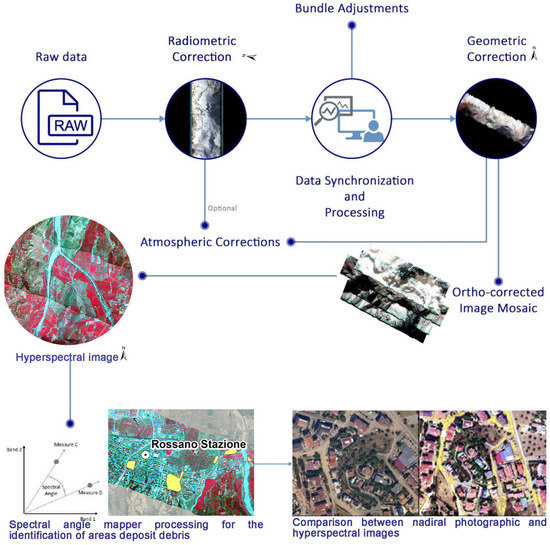 The hyperspectral images acquired during the flight, accompanied by information relating to the flight plan, are archived according to a hierarchical model necessary to guarantee the subsequent phases. We then proceed to the correction of the radiometric and geometric errors and to the georeferencing of the images [40]. The data relating to the flight are obtained with the use of data from the GNSS satellite tables and from data extracted from the inertial platform and the onboard GNSS [41]. The data returned by the onboard GNSS, measured every second from take-off to landing, contain the position and attitude of the aircraft (roll, pitch, drift). In this way, the georeferenced path traced by the aircraft associated with the hyperspectral images of the scanned area is acquired.