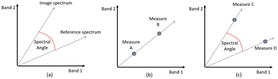 The Spectral Angle Mapper (SAM) is an algorithm for the evaluation of the similarity between a measurement and a spectral signature taken as a reference [44]. It represents a rapid classification method based on the analysis of the similarity between the reference spectral signature, defined for each class and the spectral signatures of the individual pixels. These signatures are treated by the algorithm as vectors in a space of size equal to the number of bands. Since each class is made up of a sufficiently large number of pixels, the representative spectral signature of the class is obtained as the average of the totality of spectral signatures of that given class and the similarity between the spectral signature of a generic image pixel and that of the classes is expressed as the angular distance between two vectors in the n-dimensional space [45]. Figure 3 obviously refers to only two bands. The pixel is then attributed to the class with respect to which it has a smaller angular distance: If this distance always exceeds a set maximum threshold, the pixel is labeled as unclassified. The angle is then measured in radians, between zero and n/2, where n represents the number of image bands. Thresholds characterized by small angles express high similarity between analysis and reference signatures, while large angles generate stronger dissimilarity [46].