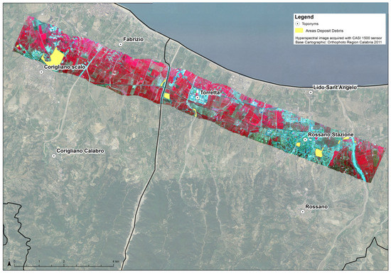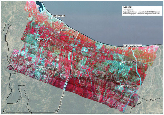 The inherent wealth of hyperspectral data makes the scans carried out with the CASI-1500 a collection of information about the territory at the date of the flight. The CASI sensor is configured in such a way as to maximize the spectral channels that can be acquired according to the required geometric resolution and the integration times required for the detection of the radiant energy reflected from the ground. For this work’s requirements, all available spectral bands were selected [34].