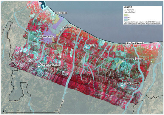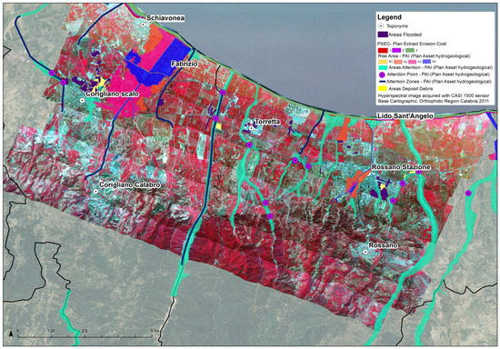 In this study, maps extracted from national datasets for hydrogeological risk management were compared with maps obtained from remote sensing activities carried out in situ. Following a flood event that affected a large area in the northeast of the Calabria Region in southern Italy, a large study was conducted on the use of airborne remote sensing for the identification and subsequent estimation of damage to services and infrastructure. Given the variety of phenomena found on the ground in the times following the flood event, the research team opted for the use of the airborne multi-sensor platform consisting of an Itres CASI1500 hyper-spectral chamber complete with INS inertial platform and GPS antenna. The integration of the sensors with specific flight plans and the comparative reading of the respective data on specific software platforms, according to a scientific protocol developed by the researchers, opens multiple thematic elaborations aimed at discretizing the complexity of anthropic and natural phenomena not easily detectable with the naked eye.