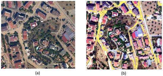From a strictly mathematical point of view, an N-channel hyperspectral measurement is a vector in an N-dimensional space. The SAM calculates the angular distance existing between the measurement and a collection of predefined spectral signatures and attributes to the measurement the same thematic label as the closest reference signature. The advantage provided by SAM is that two similar spectral signatures but with different brightness, whether due to the presence of shadows or to the normal intrinsic variability of the observed surface, appear to have low or zero angular distance [47]. This reduces the chances of misclassification due to these factors, especially in urban areas, where they are more frequent [48,49].