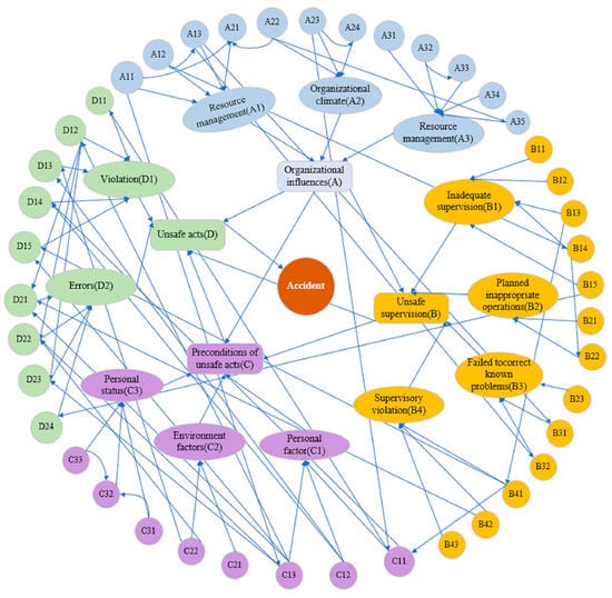 Scenario 3: When the calculated association value for the case is less than the threshold and the expert’s scoring value for the group of factors’ association is greater than the threshold, factor weighting is necessary to determine the analysis. The calculation is weighted with a ratio of 0.8:0.2. For example, the statistical value of 20% and the expert’s score of 80% can be weighted independently. If the weighted value is less than the threshold value, the group of factors is deemed irrelevant or insufficient and is not considered. The graphical structure of BN is built according to the IHFACS hierarchy by connecting nodes between the upper and lower levels of HFACS and within the same level with edges, as shown in Figure 4. All directed edges connecting nodes in the model of Figure 4 are shown in Table A1.