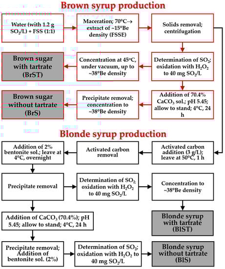 The same process was followed for the production of blonde syrups, with an additional step for pigment removal (Figure 1). Specifically, 0.3% of activated carbon was added to the FSS extract, which was then heated at 50 °C for 1 h with constant stirring. When the extract was cooled down to room temperature, it was centrifuged and filtered under vacuum to completely remove the carbon and obtain a pale-yellow extract. Then 2% w/v of bentonite was added and the extract was left at 4 °C for 24 h for stabilization (protein haze and undesirable odor removal) []. The reduction of sulfite and the extract concentration were carried out as described above to obtain the blonde syrup with tartrate (BlST). The production of blonde syrup with reduced tartrate (BlS) was carried out as in the case of the brown (BrS) syrup (Figure 1).