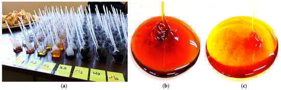 For the sensory evaluations, the syrup samples were stored at room temperature for 1 month after production and were evaluated by 10 untrained individuals who were asked to rate their sensory properties based on a 1–5 preference scale (1—Unacceptable, 2—Bad, 3—Good, 4—Very good, 5—Excellent) (consumer-oriented testing) []. The samples were coded randomly and were served to the testers at equal portions at room temperature (~22 °C). The testers were asked to taste each sample both plain and spread on bread (Figure 2). A sample of commercial grape syrup (petimezi) was also evaluated for comparison. The panel was specifically asked to evaluate each product in terms of aroma, taste, aftertaste, metallic aftertaste, and color. Specifically, aroma and taste were evaluated based on the 1–5 preference scale, while for aftertaste, the panelists were asked to comment based on the descriptions short, medium, and long, and the absence or presence of metallic taste. Finally, regarding color, the panelists were given the possibility of free description (description of shade, intensity, clarity, etc.).