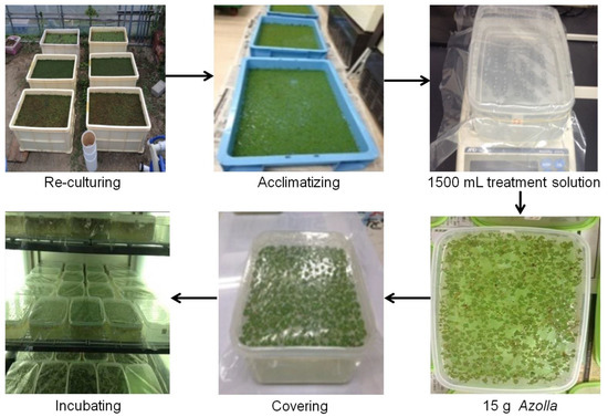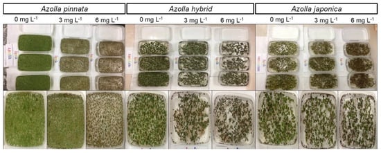 These three Azolla species were exposed to different copper (Cu) treatments in the present study. The treatments were prepared in N-free modified 1% Hoagland medium by using analytical grade CuSO4·5H2O salt to make the Cu concentrations of 0, 3, and 6 mg L−1. These Azolla species were exposed to different Cu solutions during two incubation periods, i.e., 4 and 8 days after transferring Azolla fronds. Photographic representations of plant materials, culture conditions, and experimental setups are represented in Figure 1.