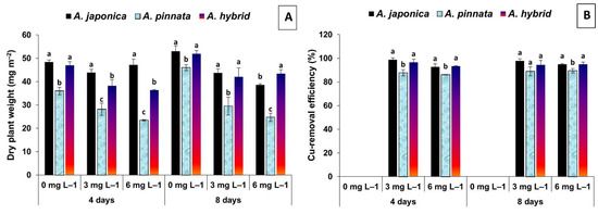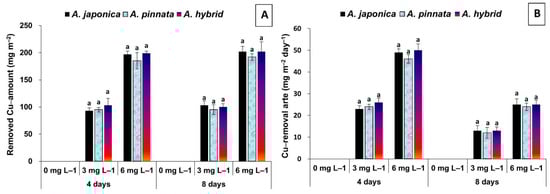 Removed amounts of Cu by three Azolla species exposed to different Cu solutions (0, 3, and 6 mg L−1) for two incubation periods (4 and 8 days) are represented in Figure 2A.