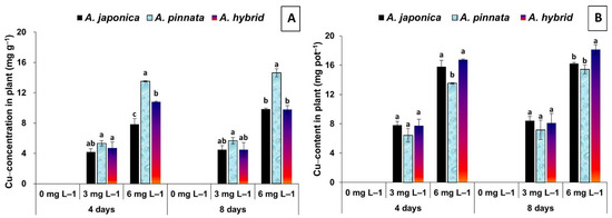 Cu contents (mg/pot) of three Azolla species exposed to different Cu treatments are shown in Figure 3B. Averaged over all treatments, Cu contents in Azolla were approximately 18 times higher than initial Cu contents in Azolla plants. Cu contents in Azolla plants were increased with an increase in solution Cu concentration, as well as with incubation time. The highest Cu content (18.1 mg pot−1 of Azolla fronds) was observed in A. hybrid after 8 days of incubation period when exposed to 6 mg L−1 Cu solution. When comparing the incubation times, A. japonica, A. pinnata, and A. hybrid, respectively, showed 2, 2.1, and 2.2 times more Cu content at 8 days of exposure to 3 mg L−1 Cu solution and 1.9, 2.1, and 2.3 times more Cu content at 8 days of exposure to 6 mg L−1 Cu solution. On average, A. hybrid retained more amounts of Cu when exposed to higher Cu concentration, which can be attributed to its larger biomass accumulation. Metal tolerance and better metal accumulation by Azolla can be ascribed to suitable attributes, such as fast growth and better biomass accumulation ability of these floating ferns [22]. A plant’s metal uptake efficiency is affected by metal concentration in the environment and that ultimately affects the plant’s phytoremediation ability [32]. Results obtained in the present study are in agreement with Sela et al. [33] and Pandey [23] who exposed two Azolla species, A.caroliniana and A. filliculoides, to Zn and Cu solutions and reported that both plants substantially accumulated metal amounts in their biomass.