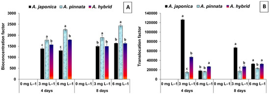 The bioconcentration factor (BCF) is a relative indicator determining the metal accumulation ability of plants to the metal concentration in the surrounding environment. Values of bioconcentration factors (BCFs) of three Azolla species exposed to different Cu solutions are presented in Figure 4A. Dry biomass was used to estimate BCF values. Interspecific variations were observed when plants were exposed to different Cu concentrations at two incubation periods. The highest BCF values 2250 and 2435 were found for A. pinnata when plants were exposed to 3 and 6 mg L− Cu solutions, respectively, for 8 days. During 4 days of incubation, BCF values of A. hybrid were higher than A. japonica. A. pinnata displayed the highest BCF values when exposed to Cu solutions at both concentration levels and both incubation times (i.e., 4 days and 8 days), indicating its potential to accumulate metals. Nevertheless, a differential response of plants was observed in BCF values after their exposure to Cu.
