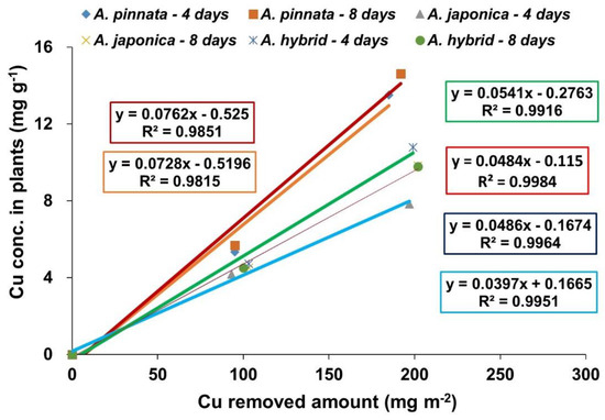 Cu concentrations in plant biomass of Azolla species have significant correlations with Cu removal amounts from solutions (Figure 6). It is plausible to conclude that the amount of Cu removed from aqueous solutions was accumulated into Azolla biomass because of highly significant relationships between these parameters. These two parameters were significantly correlated (R2 = 0.98 ** (p ≤ 0.01) in the case of A. pinnata and R2 = 0.99 ** (p ≤ 0.01) for both A. japonica and A. hybrid) for Cu removal and Cu accumulation in plant biomass in different Cu treatments during two incubation periods. This relationship indicates that this type of phytoremediation is phytoaccumulation, in which different inorganics are accumulated in plant biomass. Tested Azolla species displayed significant potential for phytoremediation of Cu which was evident from highly significant relations between these two parameters.