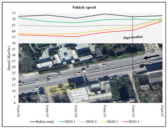 According to the collected data, the speed of vehicles gradually decreased from about 68.5 km/h to 61 km/h thirty meters before (the first point) the sign location, which indicates a sudden decrease in speed at this distance. Then, the speed reduction continued at a lower slope and decreased to 59.2 km/h and 55.6 km/h at points 3 and 4, respectively. The speed remained almost constant when passing the median opening with a length of 30 m, but it increased again after passing point 5 so that at point 6, it increased to more than 57 km/h. The speed at Signs 3 and 4 is almost the same, which can be seen in the orange line in Figure 4. The speed reduced from 69.5 km/h at point 1 to 58.12 km/h at point 4, which indicates a significant reduction. As with Sign 4, the reduction in the speed of vehicles due to the implementation of Sign 3 started from a distance of 30 m before the position of the sign and continued until the beginning of the opening (point 4). Speed changes after the installation of Signs 1 and 2 are shown in green and gray colors in Figure 4. Overall, Sign 1 made little change in reducing vehicle speed. The speed profile shows that the speed of vehicles reached from 69.5 km/h at point 1 to about 67.2 km/h at point 4 (the beginning of the median opening), which is not a significant reduction. On the other hand, a similar trend can be observed for Sign 2, where the speed of vehicles decreased from 70.7 km/h at point 1 to 64 km/h at point 4 (the beginning of the median opening), which shows a lower effect compared to Signs 3 and 4.