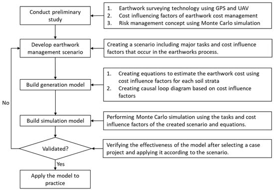 The paper is organized as follows: in Section 2, a methodology is presented. Section 3 presents the preliminary study regarding earthwork calculation technique and risk management based on Monte Carlo simulation. Section 4 presents an earthwork management scenario based on UAV from planning to completion. Section 5, Section 6 and Section 7 present the development of causal loop diagram, generation model, and simulation model of earthwork cost management. Section 8 presents the application of the model to a case study. Finally, Section 9 presents concluding remarks along with limitations and future work prospects.