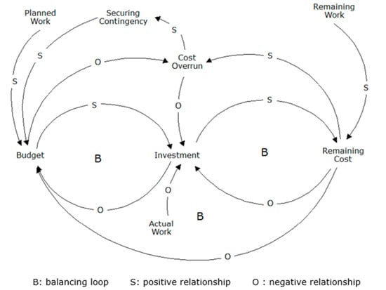 In this section, the interrelationship among factors influencing cost management in a construction project was developed as a causal loop diagram. The causal loop diagram depicts how factors are connected and illustrates the causal relationship between the factors []. The factors are represented with text labels and the causal relationships between factors are illustrated with arrows. The arrows are labeled with “s” or “o” to identify the causal effects, where “s” means positive relationship while “o” means negative relationship. Based on the diagram as shown in Figure 4, the planned work determines the budget value positively. The budget value becomes the basis for determining the investment value of a construction project. As the project starts, the actual work influences the investment value negatively. Furthermore, the remaining cost, which is obtained from the remaining work, decreases the budget and the investment value, resulting in cost overrun. When this occurs, cost contingency is secured, resulting in an increased budget. In addition, the budget decreases the value of cost overrun, while the remaining cost increases its value. This causal loop diagram of cost management can be implemented in any construction project throughout its life cycle. This study utilized the causal loop diagram specifically for cost monitoring of earthwork by comparing the planned with the actual excavation volume obtained from UAV.