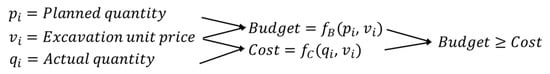 The generation model explains the mathematical relationship between excavation budget and excavation cost. The budget is calculated using the planned quantity and excavation unit rate, while the cost is calculated using actual quantity and excavation unit rate, as shown in Figure 5.