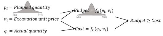The excavation unit cost rate () is the cost per m3 for each soil type . The unit cost rate for each soil type is different because the difficulty level is different. The excavation budget (), as shown in Formula (4), is the total planned cost. The excavation budget is calculated by multiplying the expected volume per soil type by the unit cost rate per soil type.