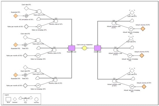 Based on the previously mentioned causal loop diagram and simulation model concept, the simulation models were created using the Powersim Studio 10 Expert program, as shown in Figure 7. Simulation model is developed as a stock and flow diagram. It illustrates the mathematical expression of the system by distinguishing stocks and flows. A stock can accumulate or be reduced while a flow causes the stock to increase or decrease []. Expected cost was calculated by adding total monthly cost per soil type. The monthly cost per soil type was calculated by multiplying planned excavation ratio per month by expected total cost per soil type. Lastly, expected total cost per soil type was obtained by multiplying the expected volume and the unit cost rate per soil type. In this simulation, MCS is applied only to the expected volume, and the simulation was performed periodically for the remaining expected volume per soil type. We could then update the excavation ratio for the remaining month in accordance with the project’s target and conditions.