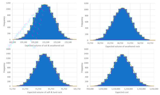 In the planning stage, a forecasting simulation was conducted using the expected earthwork volume and cost rate per soil type to obtain the excavation budget because the actual excavation had not been conducted yet. The volume of each soil type was assumed to be normally distributed. A 10% standard deviation of each initial value of soil type was used assuming no extreme variations in soil volume. For each iteration, the MCS randomly selected a value for each soil type, in accordance with specified normal distribution and standard deviation. The initial values of volume and cost rates per soil type were entered as shown in Table 2.