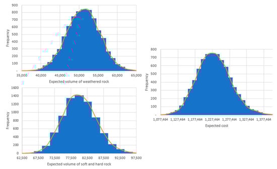 At the end of the third month, the subcontractor conducted a simulation to monitor the estimated costs that might occur until the end of the excavation period. The initial value of volume was set with 49.079 m3 for weathered rock and 75,643 m3 for soft and hard rock. Simulations were performed to forecast the expected excavation cost, as shown in Figure 10. As a result, the average, maximum, and minimum excavation costs were USD 1,222,749, USD 1,444,984, and USD 1,068,548, respectively. The maximum cost was below the maximum expected cost.
