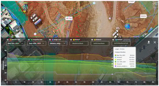 In addition to using UAV data for obtaining actual excavated volume, stakeholders can use UAV data to visualize the DSM comparison for assistance during excavation. Following the similar approach by Rachmawati and Kim [], we chose a segment of interest as the excavation target. Figure 11 shows the cross section of DSM on 31 May 2021 and 30 June 2021 along with the design level and three soil strata. This visualization helps stakeholders in observing the progress of excavation and assessing the soil type and the position of soil type that will be excavated next. In this way, stakeholders can discuss and develop strategies regarding technical excavation implementation.