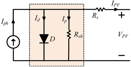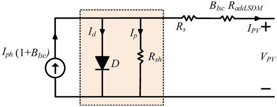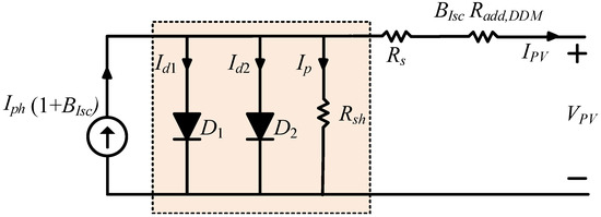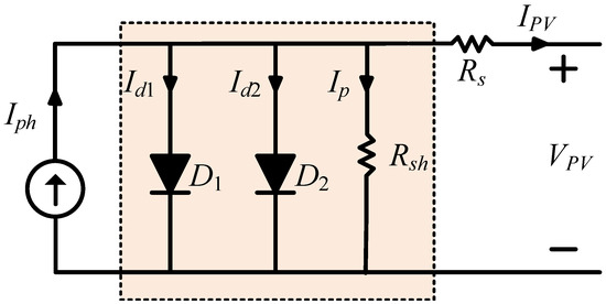 where and are the reverse diode saturation currents in and , respectively. However, and are the ideality factor parameters for and , respectively. is the current through . It is calculated using (4) as in SDM. By using (7), (8) and (4) in (6), the output PV current is expressed as follows [5]: