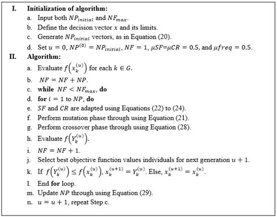 where denotes the initial population size and are the present number of objective function evaluations and their maximum value, respectively. is set to four because of the requirements requested by the mutation strategy implemented in LSHADE. At the generation, if , individuals with the worst objective function values are eliminated from the population. The parameters of the LSHADE algorithm were set according to the original LSHADE parameters as in [54]. Figure 5 and Figure 6 summarized the optimization process and pseudo-code of the LSHADE optimization algorithm for the proposed method.