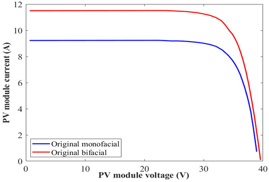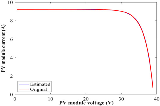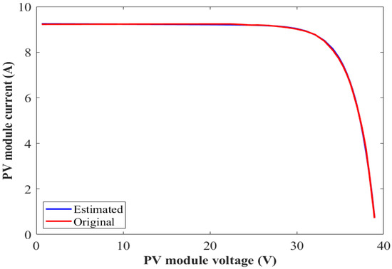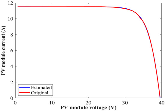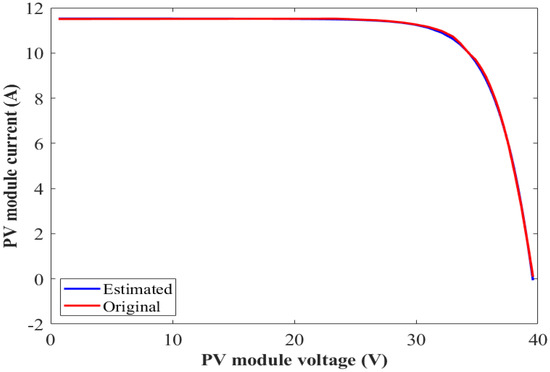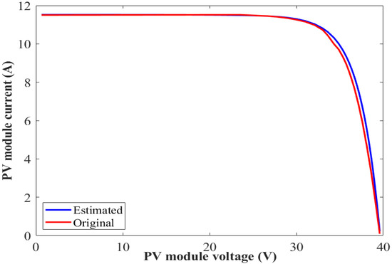 Firstly, the LSHADE algorithm is run to determine the SDM parameters at the monofacial case with 1000 W/m front irradiance and 0% rear irradiance. The five model parameters are shown in Table 2. Figure 8 shows the estimated model using the proposed LSHADE method compared to the original data from the datasheet of the BPV module. It can be seen that the proposed LSHADE method has very good fit to the original data from the datasheet curves. The RMSE value of this case is equal to 0.0321, whereas the mean absolute error (MAE) is equal to 0.0236. The R-square () value for this case is 0.9999, which confirms the excellent performance of the LSHADE algorithm to determine the SDM parameters.