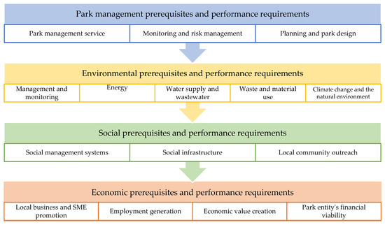 The UNIDO, in partnership with the World Bank Group and GIZ, published the first edition of the worldwide framework for EIPs in 2017, while a revised edition was published in 2021 [8]. The goal of the framework is to standardize, on a global scale, the criteria and performance levels that must be met by industrial parks for them to be designated EIPs. In addition, the organization aims to assist stakeholders in developing and transitioning to EIPs—engaging, encouraging, and consistently recognizing EIPs—and providing benchmarks to enhance the performance, sustainability, and inclusivity of the industrial sector. The framework takes an inclusive approach and creates a mutual understanding of EIPs in four key categories of prerequisite and performance requirements, as depicted in Figure 1. These categories include park management, environmental, social, and economic. The first section of the framework presents the concept, benefits, drivers of EIP implementation, and the barriers that hinder its development process. The second and third sections discuss the approach to defining performance requirements for EIPs that covers the categories mentioned previously, followed by the future prospects of the EIP.