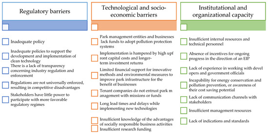 Moreover, establishing an EIP framework and strategic planning may help mitigate some of the challenges associated with its implementation. Many industrial parks have made progress toward sustainability, but only a few mature EIPs exist. As a result, park owners, operators, and businesses face various internal and external challenges, from technological limitations to poor management. An overview of some of the significant challenges for eco-industrial development, including the legislative, technological, and socioeconomic barriers and also institutional and organizational capability, are briefly discussed in Figure 2. These barriers urge different levels of parties to find solutions to foster the successful development of EIPs.