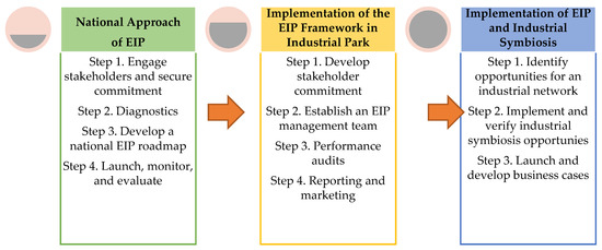 To support the framework [8], the same organizations published a practitioner’s guide [11] and practitioner’s guide toolbox [16] that indicates step-by-step explanations and a toolbox for EIP development at different levels, as depicted in Figure 3. The development of EIPs begins with the adoption of the international framework at the national level. It is then followed by the implementation of the framework at the industrial park level. Finally, the most crucial step is the implementation of industrial symbiosis. There is a wealth of literature that highlights the significant efforts made in the search for the finest tools, methodologies, and approaches to support the step of identifying opportunities for an industrial symbiosis network, including the review of industrial symbiosis tools [17,18,19], EIP optimization [20,21,22,23,24,25], and studies of industrial symbiosis fostering steps [26,27].