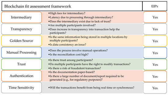 The potential application of blockchain in particular sectors can be determined by its fit assessment framework. Greater security, censorship resistance, and transparency are just a few ways blockchain technologies might benefit various uses and applications [35]. The question of whether blockchains are the appropriate technology to handle the challenges of a particular application emerges upon investigating the potential of applying blockchain techniques to that application’s domain. Reviewing the EIP framework, specifically on the critical barriers alongside the attributes of blockchain and its fit assessment framework [69,70], allows one to assess the technology’s potential for use in this setting. As can be seen in Figure 4, a potential partnership exists between blockchain technology and EIP. A blockchain-based solution will benefit in circumstances where there is a need for transactions between many parties with varying degrees of trust, as in an EIP. This technology can be used wherever the exact transaction details are being maintained in several places, such as different databases. Timeliness of data, reconciliation costs, the need for data security, and the need for authentication are all factors in determining whether a blockchain solution is a good fit for EIP development.