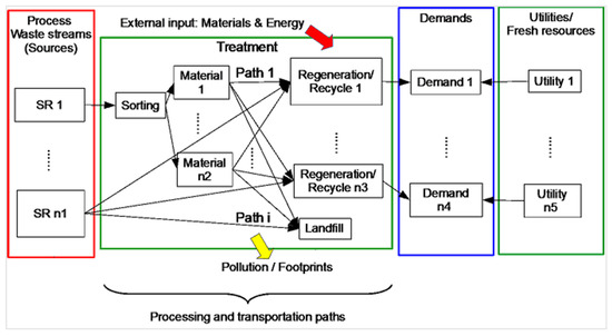 EIP is a variation of a symbiosis network where secondary resources originating from process waste/side products are delivered to process sinks, as discussed in [71]. This is a clear source-sink mapping with possible intermediate processing to adjust the properties of some source streams to match sink requirements, as in Figure 5. The intermediate processing, besides material treatment, may also take the form of energy extraction at various quality levels. The delivery and processing of the secondary raw materials from the sources to the sinks are associated with certain use of energy and auxiliary materials, resulting in some contribution to the footprints tracked within the EIP. The main premise for performing such resource reuse is that the rates of resource intake and footprint contribution of the auxiliary processes are smaller than those for supplying the required streams to the sinks from virgin resources.