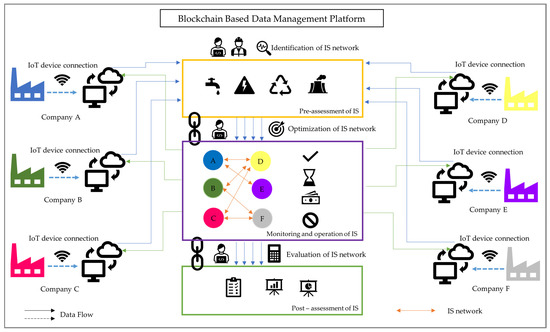 The data management platform should consider the preassessment time, which involves identifying opportunities for industrial symbiosis networks, the monitoring and operation time, and the postassessment time in the development of the EIP. The platform acts as a data-collecting platform and serves as a database platform at the park level during the preassessment period, allowing all stakeholders, particularly industries, to give data on the flow of materials, energy, and waste. The material target, prefeasibility analysis, identification of receiving and supplying enterprises, and network optimization of industrial symbiosis could all be conducted using these data. The platform’s blockchain architecture ensures that the data are secure and immutable, allowing for its storage as subsequent development processes of an EIP might take longer than expected.