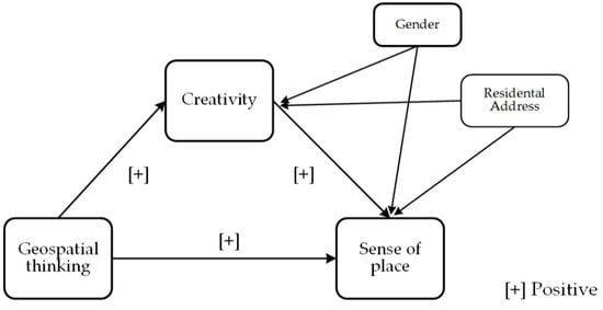 According to classical theories, such as the 4P theory of creativity and the investment theory of creativity, we can find that creativity is influenced by various factors. For example, personal factors, such as emotion, gender, motivation, and self-identity [83,84,85,86], have an impact on creativity. In addition, creativity can also be influenced by external factors, including the physical environment and social culture [87,88]. In addition, geospatial thinking may affect creativity. People with geospatial thinking are able to have a greater understanding of their environment [24], which enables them to modify their space in a novel way to make it fit for purpose. Firstly, according to creativity investment theory [32], geospatial thinking constitutes a critical cognitive resource. In other words, the more cognitive resources one has (i.e., having a high level of geospatial thinking), the more a person can modify their space in new and useful ways. Secondly, the various types of creativity products in the 4C theory of creativity are the result of learning something new in the environment [82]. Geospatial thinking, on the other hand, can help in the understanding of the environment [24], which leads to a better learning of new things. Finally, the role of environmental forces is emphasized in the 4P theory of creativity [32]. Geospatial thinking, as awareness of the environment, can serve as a resource, which, when invested in, might produce creativity.