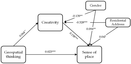 As can be seen in Table 3, both gender and family residence have an effect on sense of place when exploring the relationship between geospatial thinking and sense of place. Firstly, gender had a significant effect on sense of place (β = 0.072, t = 2.119, p < 0.05) while family residence did not. The effect of gender on sense of place was significantly increased by including creativity in the model (β = 0.094, t = 2.827, p < 0.01), but there was still no significant relationship between family residence and sense of place. Figure 2 provides a graphic representation of these relationships.