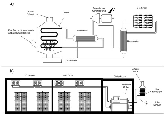 Our proposed CCP unit includes a power generation sub-unit based on an organic Rankine cycle (ORC) driven by the direct combustion of biomass and waste. The waste heat from the exhaust of the combustion process is then recovered (plus additional heat from direct combustion if necessary) and utilised for powering an absorption chiller that maintains the temperature of two cold rooms, one operated at −20 °C (cold store) and the other at 3 °C (cool-store). These two storage rooms’ capacities are determined by the masses of crops and fish that need to be preserved.