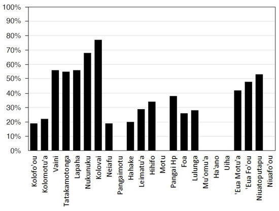 Agricultural activity in Tonga is mainly for the local market, and only 5% of the households are engaged in commercial agricultural activities [6]. In recent years, agriculture’s share in the economy has decreased due to a decline in the export market [35]. Fishing is the other significant source of livelihood. However, it is mostly pursued at the subsistence or semi-subsistence level, and only 4% of people are engaged in commercial fishing [6]. In 2018, the total annual catch was 463 tonnes, reduced by 37% compared to 2017, partially because of decreased fishing efforts [36].