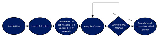 In addition, Delphi’s capability for determining a specific expert’s skills, abilities, or knowledge is emphasised. The Delphi implementation process is carried out in several steps. As depicted in Figure 2, an oval shape is usually used for a flowchart’s start and stop steps.