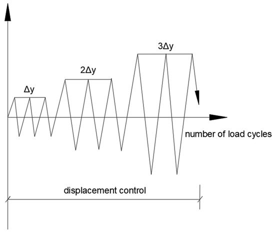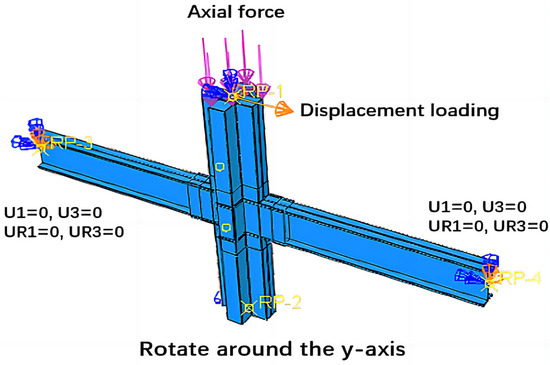 This study adopted the column-end loading method in Specification of Testing Methods for Earthquake Resistant Building [35], i.e., a constant axial pressure is applied at the top of the column, and then a reciprocating horizontal load is applied at the reference point with a displacement increment of 5 mm. The loading regime is shown in Figure 3. The loading stops when either the entire section of the model reaches the ultimate stress or its ultimate bearing capacity drops below 85%. The top surface of the column is coupled with reference point RP1, for which the translation in the y direction and the rotation in the y and z directions are restricted. The axial load at the column top is simulated by applying pressure on the top surface of the column, and horizontal earthquake action is simulated by applying reciprocal horizontal displacement to the reference point RP1 in increments of 5 mm. The bottom surface of the column is coupled with reference point RP2, for which the translations in x, y, and z directions are restricted. To avoid instability in the overall structure, the rotations of the column bottom around the x and z axes are also restricted. The surfaces of the left and right beam ends are coupled with RP3 and RP4, respectively; their degree of freedom in the z direction is limited. The loading diagram is shown in Figure 4.