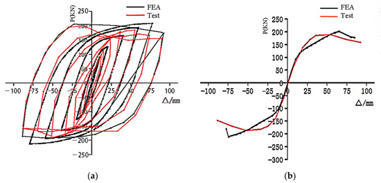 Comparison of the tested and simulated results. (a) Hysteretic curve; (b) Skeleton curve.