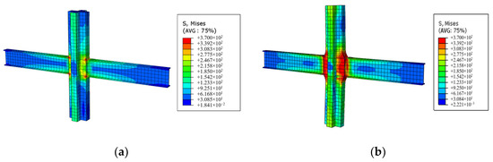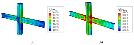Specimen JD1 was selected as an example because the failure phenomenon and characteristics of JD3–JD8 were similar to those of JD1. Figure 7 below shows the von Mises stress nephogram acquired by performing the low-cycle reciprocating loading test. Figure 7a shows that connections among the steel tube columns, beam flanges, and side plates begin to yield when the horizontal displacement of column ends increases to 37.44 mm, while the other parts of the core concrete, steel tube column, and steel beam are still in the elastic stage. The plasticity of the joint panel zone develops fully with further increase in displacement. The joint reaches the ultimate state when the horizontal displacement increases to 100.34 mm. At this time, the ultimate bearing capacity is 202.04 kN, as shown in the von Mises stress nephogram in Figure 7b. Subsequently, as loading continues, the bearing capacity starts to decline. Once the bearing capacity reaches 85% of the ultimate bearing capacity, the loading ends.