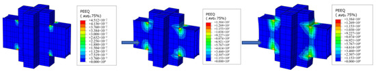 PEEQ is the result of the accumulation of plastic strains throughout the deformation process. The absolute value of each plastic strain increment is summed and its value will only be positive Figure 8 shows the equivalent plastic strain (PEEQ) in the loading process of specimen JD1, revealing the expansion process of the plastic hinge. First, a plastic zone is formed at the column corner of the beam–column connection. Then, the plastic hinge gradually expands on the column walls and side plates with an increase in loading displacement. Finally, the bearing capacity of joints starts declining because of the joint failure, which is caused by the penetration of the plastic hinge into the entire section of the beam–column connection.