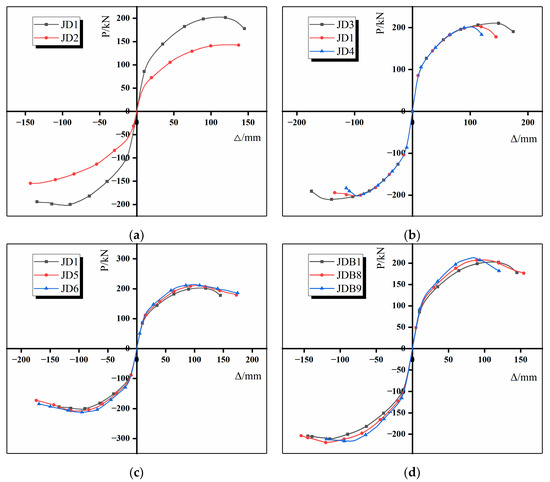 Similarly, the skeleton curves of specimens JD1, JD7, and JD8 in Figure 10d show that the skeleton curve slope, initial stiffness of joints, and ultimate bearing capacity increase with an increase in the thickness of the side plates.