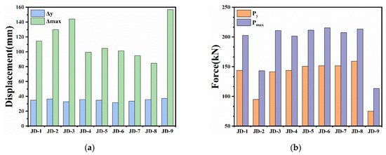 Load and displacement of the feature point of each model. (a) Yield displacement and ultimate displacement; (b) Yield load and ultimate load.