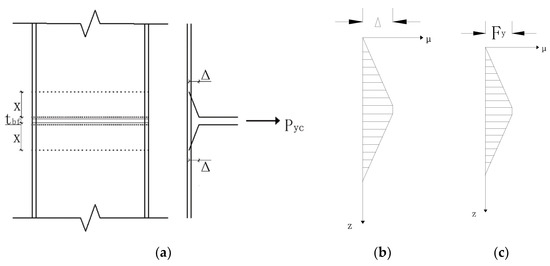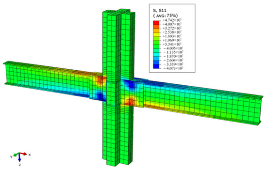 Figure 7b shows the von Mises stress nephogram of specimen JD1 in the ultimate state. The plasticity of the column sidewall develops sufficiently after yielding. The sidewall at a certain height (x) of the beam flange reached the ultimate stress in the ultimate state. Figure 14 shows the corresponding stress distribution of the sidewall. On replacing fy,acf with fu, we obtain Equations (5) and (6).