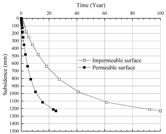 Figure 3 shows that the deep soft soil layer leads to a very long consolidation time, which is approximately 100 years when the bottom surface is impervious and approximately 25 years when the bottom surface is permeable. When the bottom surface is impervious, the land subsidence rates during 0–20 years, 20–40 years and 40–60 years are 32.5 mm/a, 16.5 mm/a and 5.8 mm/a, respectively. When the bottom surface is permeable, the land subsidence rates from 0 to 5 years, 5 to 10 years and 10 to 15 years are 130 mm/a, 66 mm/a and 23.2 mm/a, respectively.