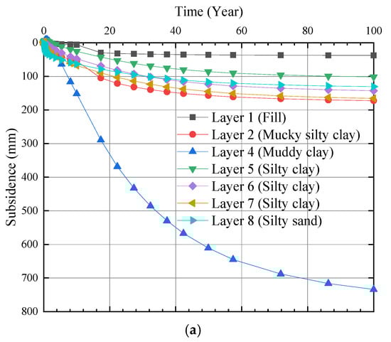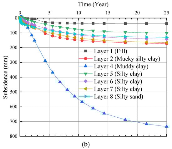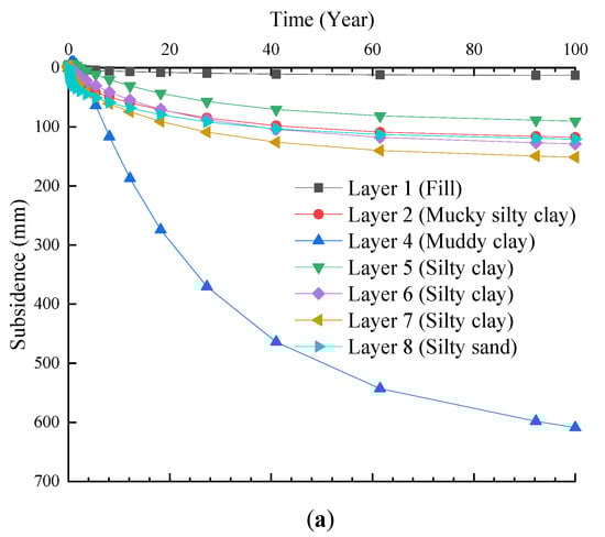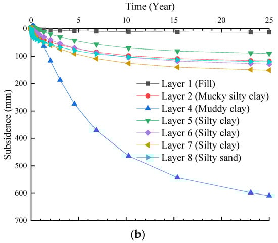 Development of land subsidence for each soil layer with time under backfill and surcharge. (a) Impermeable surface. (b) Permeable surface.